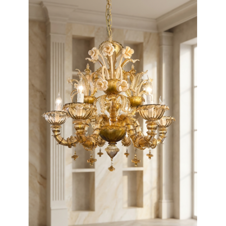 Lampadario veneziano color ambra a sei luci più gabbia con tre cimieri.            Eseguito interamente a mano con antiche tecniche muranesi, lavorazione a vetro soffiato e vetro massello.                             ...