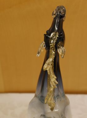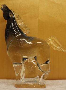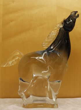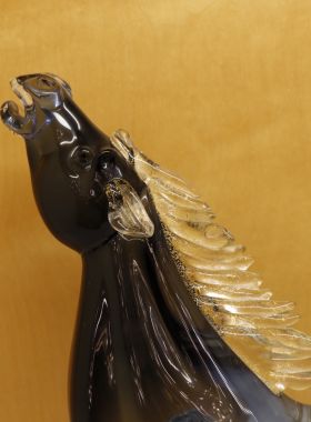 Bellissima scultura di cavallo in vetro di Murano lavorato a mano. Il pezzo viene modellato a caldo dal nostro Maestro Luigi Moro. La tecnica della lavorazione è quella del vetro massiccio (o massello). Consiste nel plasmare il vetro ancora allo stato pastoso utilizzando pinze, palette e forbici. Per creare questo tipo di sculture c’è bisogno di tanto tempo perché ha bisogno di frequenti riscaldamenti per poter mantenere il vetro modellabile. La criniera e la coda sono stati decorati con la foglia oro.
