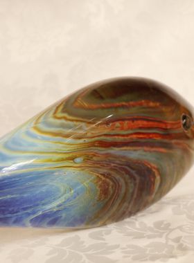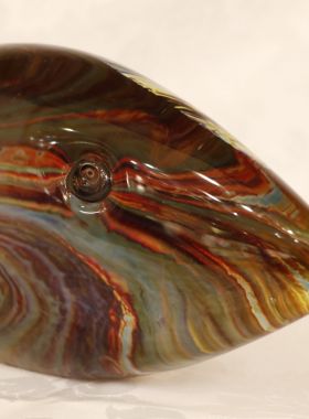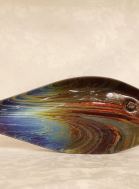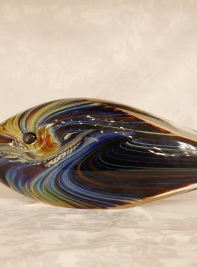 Bellissima scultura rappresentante un pesce. Il tipo di vetro utilizzato si chiama Calcedonio. E’ uno dei più vecchi e uno dei più rari tipi di vetro. I colori, le ombre e le sfumature del misterioso calcedonio vengono dal processo chimico intrinseco ad ogni fusione del vetro. E’ una reazione dovuta all’effetto che il metallo argentato ha sui minerali e le sostanze che si trovano nel vetro.