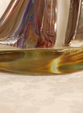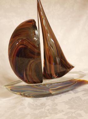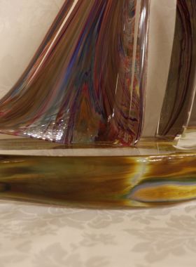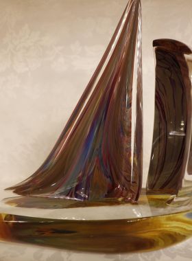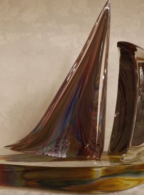 Bellissima scultura rappresentante una barca a vela. Il tipo di vetro utilizzato si chiama Calcedonio. E’ uno dei più vecchi e uno dei più rari tipi di vetro. I colori, le ombre e le sfumature del misterioso calcedonio vengono dal processo chimico intrinseco ad ogni fusione del vetro. E’ una reazione dovuta all’effetto che il metallo argentato ha sui minerali e le sostanze che si trovano nel vetro.