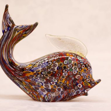 Bellissima scultura realizzata con murrine multicolori. Scultura eseguita a mano presso la nostra fabbrica. La tecnica della lavorazione è quella del vetro massiccio (o massello). Consiste nel plasmare il vetro ancora allo stato pastoso utilizzando pinze, palette e forbici. Il vetro viene raccolto su un puntello più volte fino a formare la massa di vetro utile alla lavorazione. E’ stata utilizzata la foglia d’oro per la decorazione di alcuni dettagli. La foglia d’oro ad alte temperature si rompe ma non brucia. Pezzo unico al mondo nel colore e nella forma essendo fatto unicamente a mano senza uso di stampi e forme.