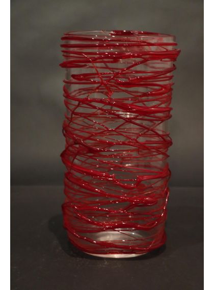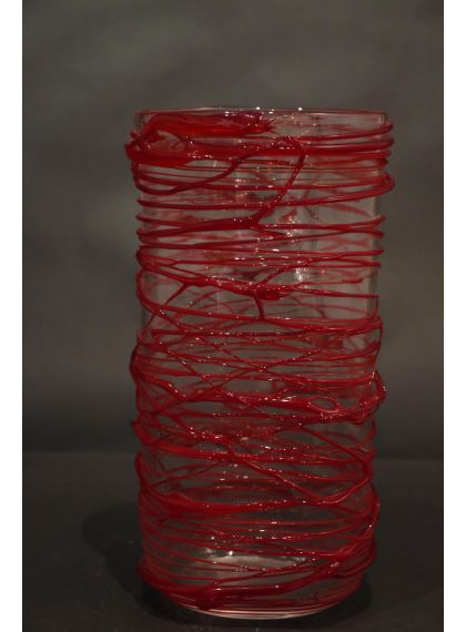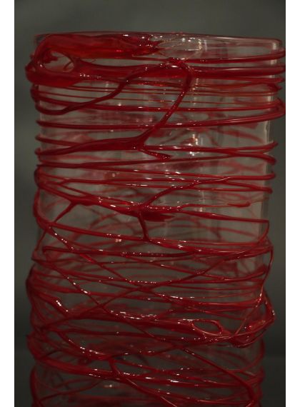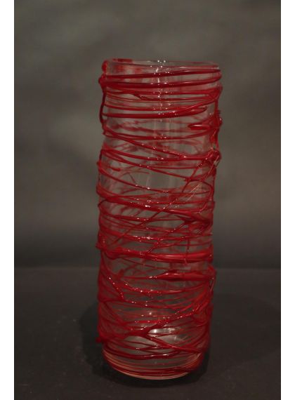 Prodotto presso la nostra fabbrica a Murano con la tecnica del vetro soffiato. Bellissimo vaso dalla forma cilindrica. Il vaso è impreziosito dalla decorazione a fili di color rosso. Il maestro crea questo gioco di fili che rende il vaso ancora più particolare ed unico. La decorazione è presente sulla superficie esterna, mentre all'interno del vaso la superficie è liscia. Vaso eseguito completamente a mano.