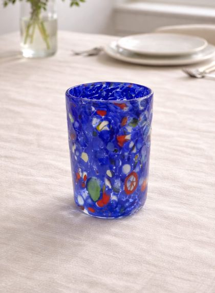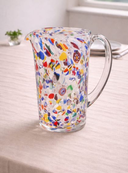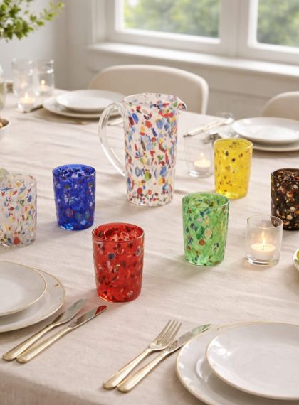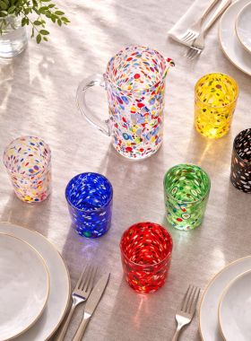 Servizio da tavola multicolore con 6 bicchieri di colore diverso + caraffa colorata