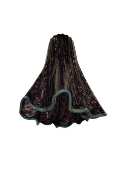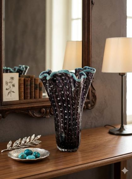 Per la tecnica del BALOTON il maestro si affida all’uso di uno stampo in metallo, con punte a piccola piramide dalla base quadrata lungo tutta la superficie interna della sua circonferenza che soffia il vetro all'interno. Il vetro espandendosi riempie i vuoti, creando il caratteristico decoroNella soffiatura, il vetro ne riempie completamente il vuoto e restituisce un particolare effetto ottico di rilievo incrociato. I modelli classici sono rifiniti con un filo colorato applicato a caldo sulla bocca del vaso. Materiale: Autentico vetro di Murano soffiato a bocca e lavorato interamente a mano