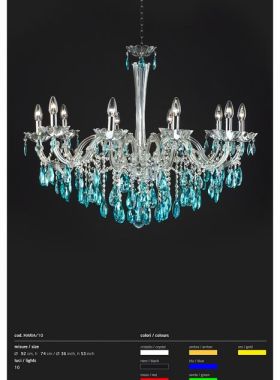 Lampadario realizzato presso la nostra vetreria a Murano. Il lampadario nella foto ha le gocce di colore acquamarina però è possibile realizzarlo anche in altri colori. I colori disponibili sono cristallo, nero, rosso, ambra, blu e verde. E’ possibile ordinare il lampadario in diverse misure.