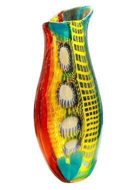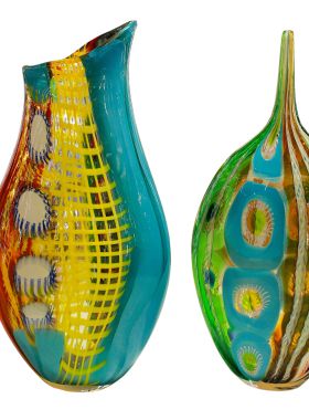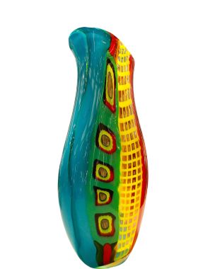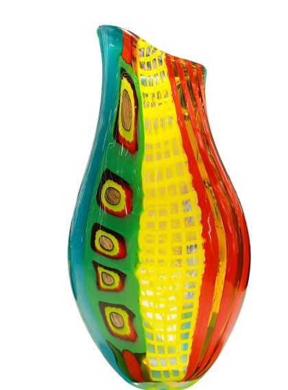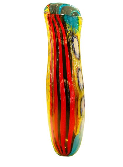 La lavorazzione di questo ogetto rappresenta l'incontro tra la tradizione millenaria e il design contemporaneo. Le decorazioni (murrine e canne) sono state fuse insieme nella fornace a temperature altissime (oltre 1000°C) per creare una composizione unica. Dopo il raffreddamento, il vaso è stato lavorato con mole d'acqua per uniformare la superficie, eliminare i rilievi delle murrine e donare al vetro una finitura perfettamente liscia o satinata (come il "battuto"). La lavorazione a pietra è un processo lungo e rischioso che trasforma il vetro da un semplice oggetto soffiato a una scultura rifinita a mano. Questa tecnica garantisce che ogni pezzo sia un pezzo unico, tipico delle fornaci d'eccellenza muranese. Sono opere di alta qualità che celebrano la maestria del "freddo e del caldo", dove il colore esplosivo della fornace viene disciplinato dalla precisione della molatura manuale del maestro vetraio.