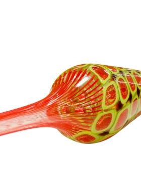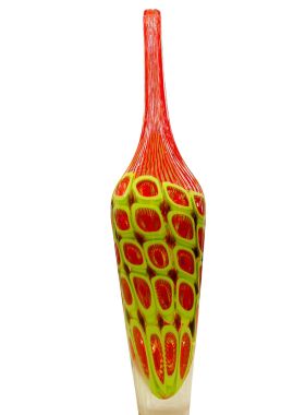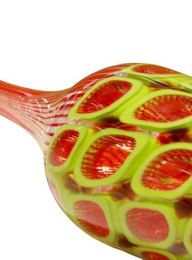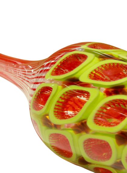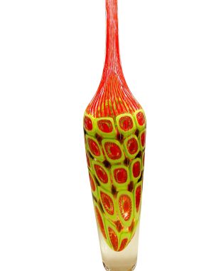 La lavorazzione di questo ogetto rappresenta l'incontro tra la tradizione millenaria e il design contemporaneo. Le decorazioni (murrine e canne) sono state fuse insieme nella fornace a temperature altissime (oltre 1000°C) per creare una composizione unica. Dopo il raffreddamento, il vaso è stato lavorato con mole d'acqua per uniformare la superficie, eliminare i rilievi delle murrine e donare al vetro una finitura perfettamente liscia o satinata (come il "battuto"). La lavorazione a pietra è un processo lungo e rischioso che trasforma il vetro da un semplice oggetto soffiato a una scultura rifinita a mano. Questa tecnica garantisce che ogni pezzo sia un pezzo unico, tipico delle fornaci d'eccellenza muranese. Sono opere di alta qualità che celebrano la maestria del "freddo e del caldo", dove il colore esplosivo della fornace viene disciplinato dalla precisione della molatura manuale del maestro vetraio.