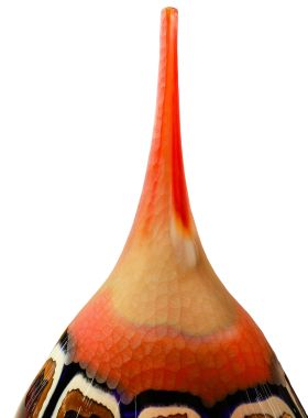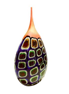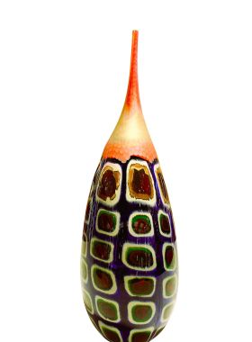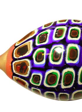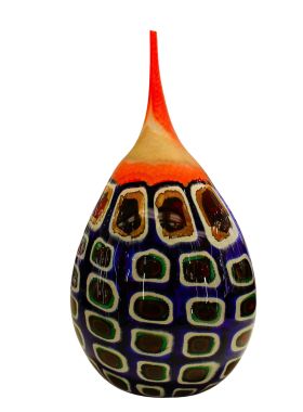 La lavorazzione di questo ogetto rappresenta l'incontro tra la tradizione millenaria e il design contemporaneo. Le decorazioni (murrine e canne) sono state fuse insieme nella fornace a temperature altissime (oltre 1000°C) per creare una composizione unica. Dopo il raffreddamento, il vaso è stato lavorato con mole d'acqua per uniformare la superficie, eliminare i rilievi delle murrine e donare al vetro una finitura perfettamente liscia o satinata (come il "battuto"). La lavorazione a pietra è un processo lungo e rischioso che trasforma il vetro da un semplice oggetto soffiato a una scultura rifinita a mano. Questa tecnica garantisce che ogni pezzo sia un pezzo unico, tipico delle fornaci d'eccellenza muranese. Sono opere di alta qualità che celebrano la maestria del "freddo e del caldo", dove il colore esplosivo della fornace viene disciplinato dalla precisione della molatura manuale del maestro vetraio.