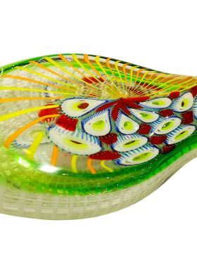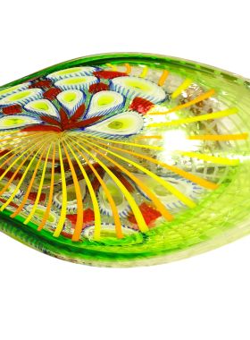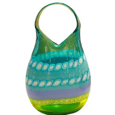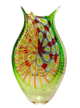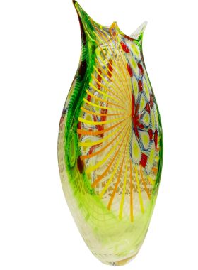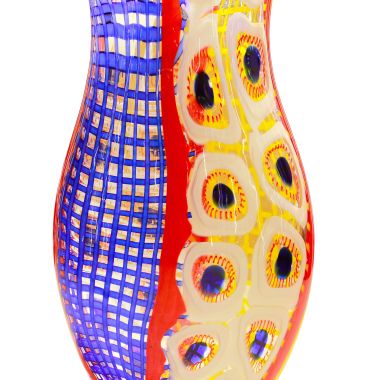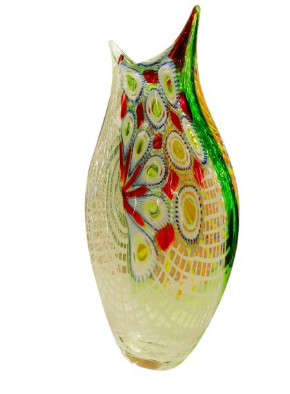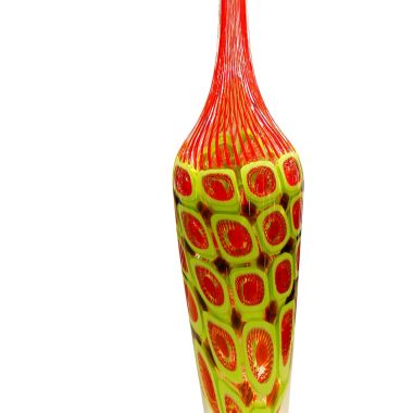 La lavorazzione di questo ogetto rappresenta l'incontro tra la tradizione millenaria e il design contemporaneo. Le decorazioni (murrine e canne) sono state fuse insieme nella fornace a temperature altissime (oltre 1000°C) per creare una composizione unica. Dopo il raffreddamento, il vaso è stato lavorato con mole d'acqua per uniformare la superficie, eliminare i rilievi delle murrine e donare al vetro una finitura perfettamente liscia o satinata (come il "battuto"). La lavorazione a pietra è un processo lungo e rischioso che trasforma il vetro da un semplice oggetto soffiato a una scultura rifinita a mano. Questa tecnica garantisce che ogni pezzo sia un pezzo unico, tipico delle fornaci d'eccellenza muranese. Sono opere di alta qualità che celebrano la maestria del "freddo e del caldo", dove il colore esplosivo della fornace viene disciplinato dalla precisione della molatura manuale del maestro vetraio.
