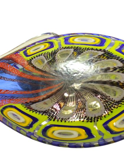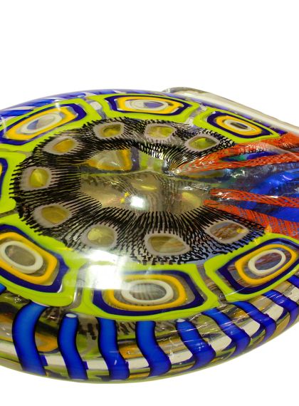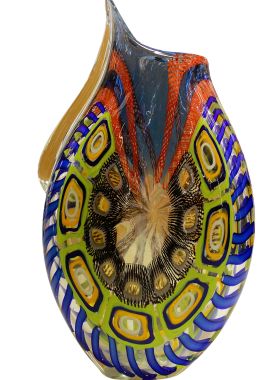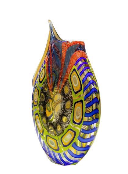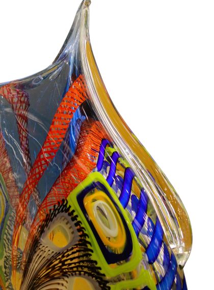 La lavorazzione di questo ogetto rappresenta l'incontro tra la tradizione millenaria e il design contemporaneo. Le decorazioni (murrine e canne) sono state fuse insieme nella fornace a temperature altissime (oltre 1000°C) per creare una composizione unica. Dopo il raffreddamento, il vaso è stato lavorato con mole d'acqua per uniformare la superficie, eliminare i rilievi delle murrine e donare al vetro una finitura perfettamente liscia o satinata (come il "battuto"). La lavorazione a pietra è un processo lungo e rischioso che trasforma il vetro da un semplice oggetto soffiato a una scultura rifinita a mano. Questa tecnica garantisce che ogni pezzo sia un pezzo unico, tipico delle fornaci d'eccellenza muranese. Sono opere di alta qualità che celebrano la maestria del "freddo e del caldo", dove il colore esplosivo della fornace viene disciplinato dalla precisione della molatura manuale del maestro vetraio.