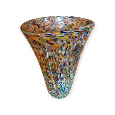 Questa specifica tipologia di manufatto muranese è un'esplosione di cromatismo e tecnica artigianale. La definizione "Arlecchino"rappresenta l'eccellenza della lavorazione del vetro a caldo. Si distingue per la tecnica della graniglia di vetro multicolore, un processo che richiede estrema precisione termica e sensibilità estetica. La superficie non è dipinta, ma è composta da migliaia di frammenti di vetro colorato (graniglie) che vengono applicati sulla massa vitrea incandescente durante la soffiatura, attraverso ripetuti passaggi nel forno i colori si fondono nel corpo centrale, rimanendo però distinti e vividi.