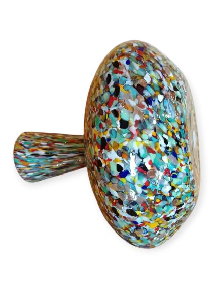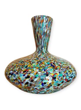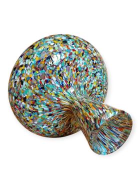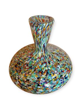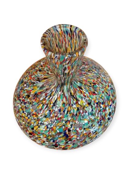 Questa specifica tipologia di manufatto muranese è un'esplosione di cromatismo e tecnica artigianale. La definizione "Arlecchino"rappresenta l'eccellenza della lavorazione del vetro a caldo. Si distingue per la tecnica della graniglia di vetro multicolore, un processo che richiede estrema precisione termica e sensibilità estetica. La superficie non è dipinta, ma è composta da migliaia di frammenti di vetro colorato (graniglie) che vengono applicati sulla massa vitrea incandescente durante la soffiatura, attraverso ripetuti passaggi nel forno i colori si fondono nel corpo centrale, rimanendo però distinti e vividi.