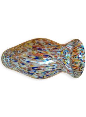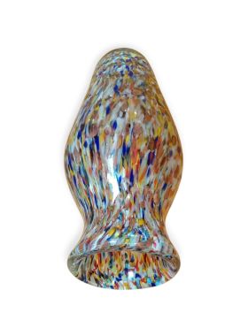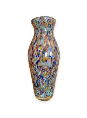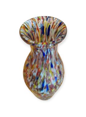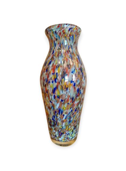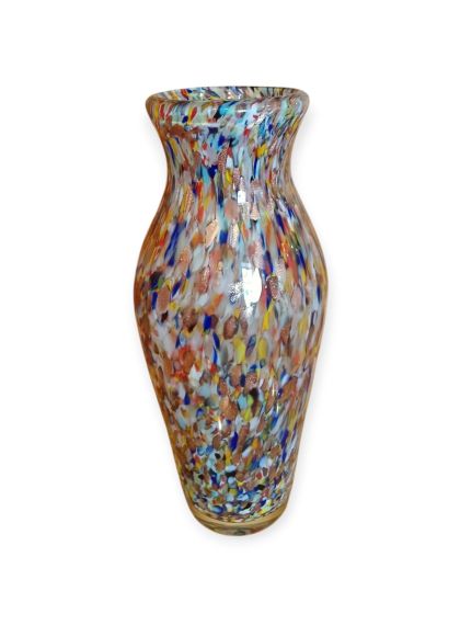 Questa specifica tipologia di manufatto muranese è un'esplosione di cromatismo e tecnica artigianale. La definizione "Arlecchino"rappresenta l'eccellenza della lavorazione del vetro a caldo. Si distingue per la tecnica della graniglia di vetro multicolore, un processo che richiede estrema precisione termica e sensibilità estetica. La superficie non è dipinta, ma è composta da migliaia di frammenti di vetro colorato (graniglie) che vengono applicati sulla massa vitrea incandescente durante la soffiatura, attraverso ripetuti passaggi nel forno i colori si fondono nel corpo centrale, rimanendo però distinti e vividi.