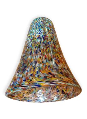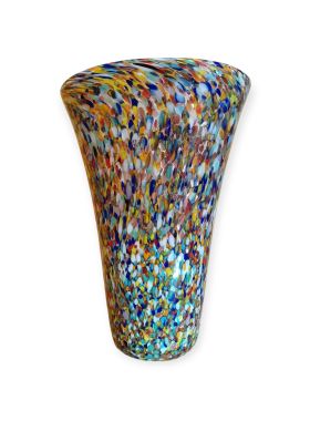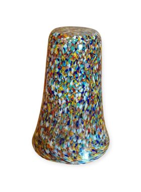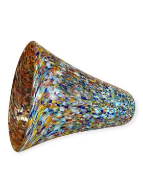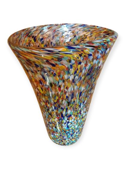 Questa specifica tipologia di manufatto muranese è un'esplosione di cromatismo e tecnica artigianale. La definizione "Arlecchino"rappresenta l'eccellenza della lavorazione del vetro a caldo. Si distingue per la tecnica della graniglia di vetro multicolore, un processo che richiede estrema precisione termica e sensibilità estetica. La superficie non è dipinta, ma è composta da migliaia di frammenti di vetro colorato (graniglie) che vengono applicati sulla massa vitrea incandescente durante la soffiatura, attraverso ripetuti passaggi nel forno i colori si fondono nel corpo centrale, rimanendo però distinti e vividi.
