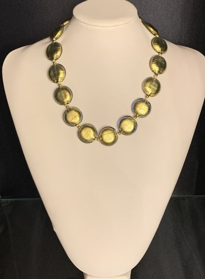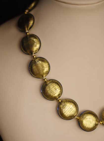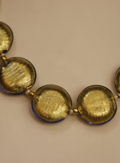 Ogni perla è realizzata singolarmente a mano. Per impreziosire la collana è stata aggiunta la foglia d'oro dentro ogni singola perla. L'oro da una brillantezza unica alle perle. Il primo passo per creare una perla è fondere il vetro davanti alla fiamma. Il maestro prende un bastoncino di rame ( che assicurerà la presenza del foro nella perla ) e inizia a colare il vetro su di esso, ruotando il bastoncino per creare una forma uniforme e tondeggiante, delle dimensioni desiderate. Per creare la forma desiderata il maestro utilizza diversi strumenti. La pinza piatta può essere utile per appiattire completamente una perla o per torcerla in una spirale, mentre una appuntita può essere utilizzata per pizzicarla e modellarla in forme creative. Un altro strumento utile sono le forbici che consentono al maestro di creare piccoli tagli nel vetro, mentre è ancora incandescente. Ci sono molteplici pinze per ottenere forme specifiche, come sfere, quadrati e cuori di varie dimensioni.