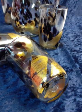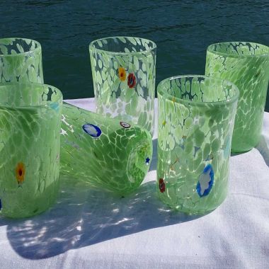 Prodotto eseguito a mano dal Maestro Giuseppe Tagliapietra con la tecnica del vetro soffiato nell'isola di Murano. A Murano questo bicchiere viene chiamato Goto. Servizio perfetto per qualsiasi occasione infatti i bicchieri si possono utilizzare tutti i giorni per vino, acqua, aperitivi e cocktails. La caraffa senza manico è stata pensata dal maestro per renderla unica. Il collo della caraffa è stato allungato per poterla utilizzare facilmente. Per impreziosire tutto è stata aggiunta la foglia oro.