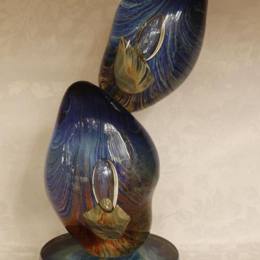 Bellissima scultura rappresentante un pesce. Il tipo di vetro utilizzato si chiama Calcedonio. E’ uno dei più vecchi e uno dei più rari tipi di vetro. I colori, le ombre e le sfumature del misterioso calcedonio vengono dal processo chimico intrinseco ad ogni fusione del vetro. E’ una reazione dovuta all’effetto che il metallo argentato ha sui minerali e le sostanze che si trovano nel vetro.
