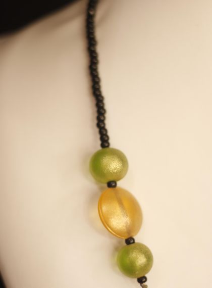 Collana in perle fatta a mano in vetro di Murano con la tecnica della lavorazione a lume. Ogni perla è realizzata singolarmente a mano. Per impreziosire la collana è stata aggiunta la foglia d'oro dentro ogni singola perla. L'oro da una brillantezza unica alle perle. Con il calore della fiamma l’oro si spezza ma non brucia. Le nostre creazione vi faranno sentire uniche. Per chi vuole sorprendere la propria donna le nostre collane fanno sicuramente al caso vostro.