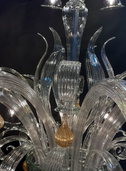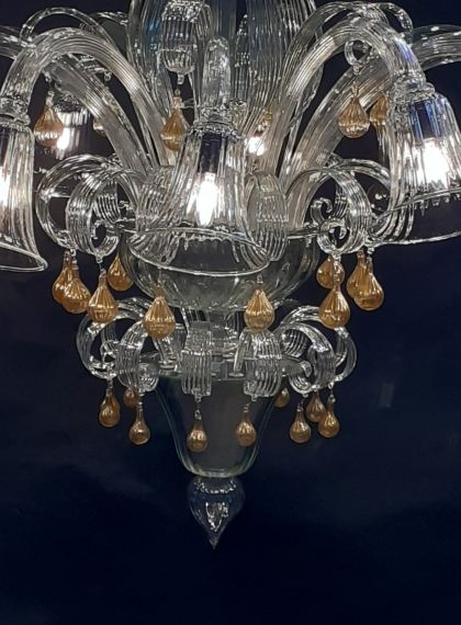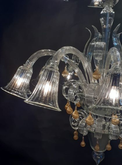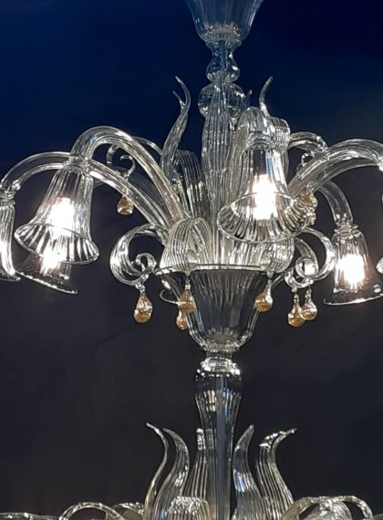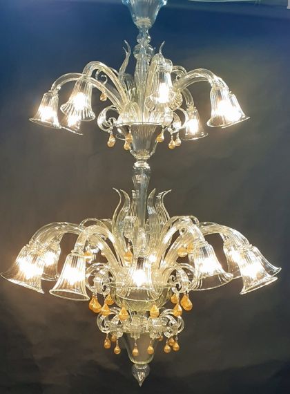 Lampadario 20 luci in vetro di Murano cristallo con decorazione dei pendagli oro 24 karati. Lampadario realizzato completamente a mano dai nostri maestri vetrai. Si può realizzate in diverse misure a seconda delle esigenze. Viene spedito con impianto elettrico già fatto a seconda del paese di destinazione. Pezzi di ricambio inclusi nell'ordine.
