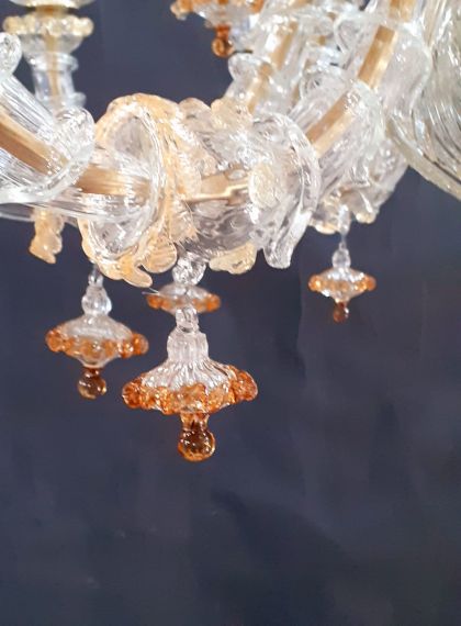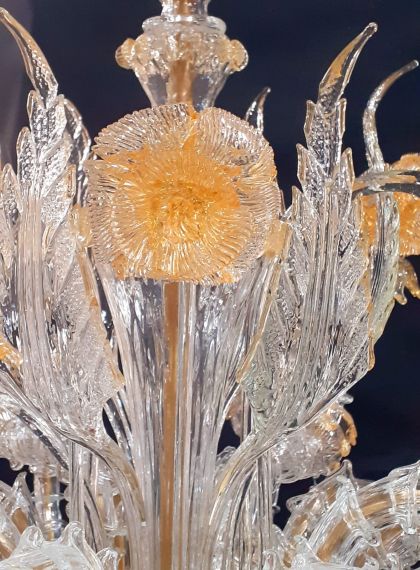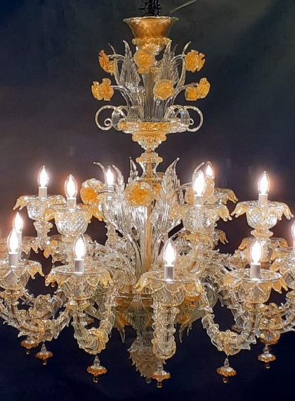 Lampadario Rezzonico 12+12 luci realizzato in cristallo con decorazione foglia oro 24 karati. Lampadario molto ricco di elementi. Ci sono foglie alte e basse ed anche fiori alti e bassi. Le braccia sono composte da varie bossole che vengono incastrate alla perfezione. Si può realizzate in diverse misure a seconda delle esigenze. Viene spedito con impianto elettrico già fatto a seconda del paese di destinazione. Pezzi di ricambio inclusi nell'ordine.