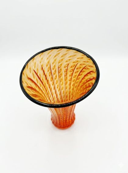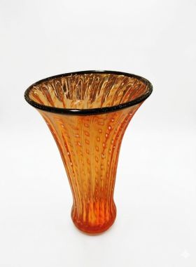 Per la tecnica del BALOTON il maestro si affida all’uso di uno stampo in metallo, con punte a piccola piramide dalla base quadrata lungo tutta la superficie interna della sua circonferenza che soffia il vetro all'interno. Il vetro espandendosi riempie i vuoti, creando il caratteristico decoroNella soffiatura, il vetro ne riempie completamente il vuoto e restituisce un particolare effetto ottico di rilievo incrociato. I modelli classici sono rifiniti con un filo colorato applicato a caldo sulla bocca del vaso. Materiale: Autentico vetro di Murano soffiato a bocca e lavorato interamente a mano