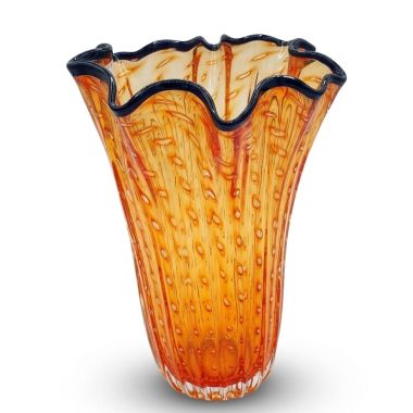 Per la tecnica del BALOTON il maestro si affida all’uso di uno stampo in metallo, con punte a piccola piramide dalla base quadrata lungo tutta la superficie interna della sua circonferenza che soffia il vetro all'interno. Il vetro espandendosi riempie i vuoti, creando il caratteristico decoroNella soffiatura, il vetro ne riempie completamente il vuoto e restituisce un particolare effetto ottico di rilievo incrociato. I modelli classici sono rifiniti con un filo colorato applicato a caldo sulla bocca del vaso. Materiale: Autentico vetro di Murano soffiato a bocca e lavorato interamente a mano