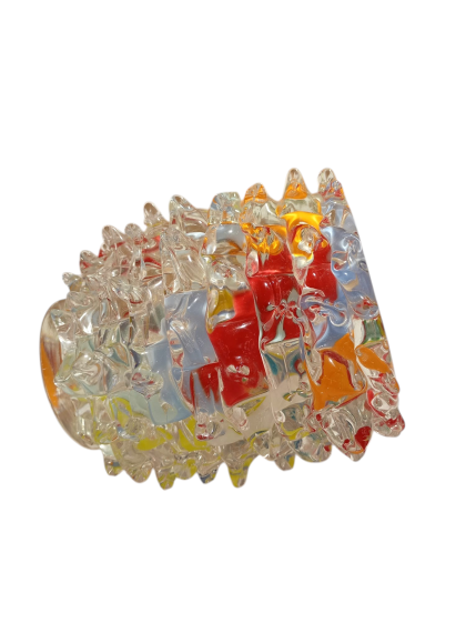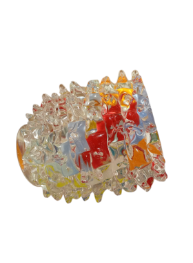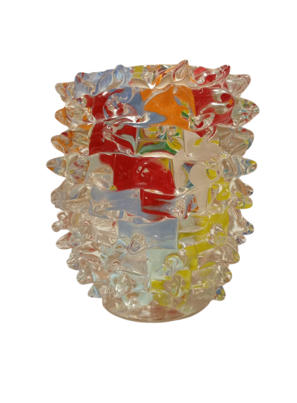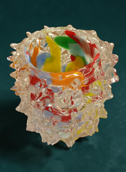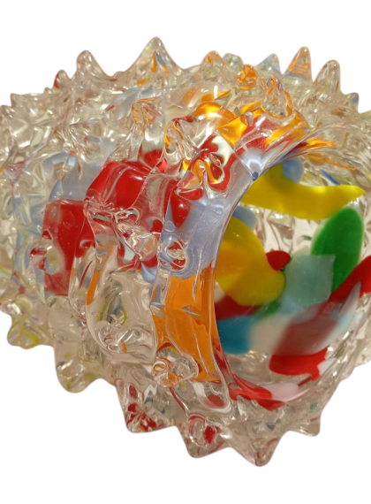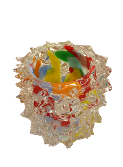 Questo pezzo è un esempio affascinante di arte vetraria muranese contemporanea lavorate a mano, ci sono alcuni elementi distintivi che rendono questo modello unico rispetto alla produzione industriale o seriale. Ecco una distinzione dettagliata del modelloTecnica Rostrato: Superficie "a punte" modellata a mano, segno di pura artigianalità e asimmetria voluta.Macie di Colore: Inserti cromatici sospesi nel cristallo che rendono ogni pezzo un esemplare unico e irripetibile.Contrasto Materico: Un equilibrio perfetto tra la forza delle punte e la trasparenza luminosa del vetro.Segni di Autenticità: La presenza del "pontello" (la cicatrice della lavorazione) ne certifica l'origine muranese e il valore di scultura tattile.
