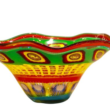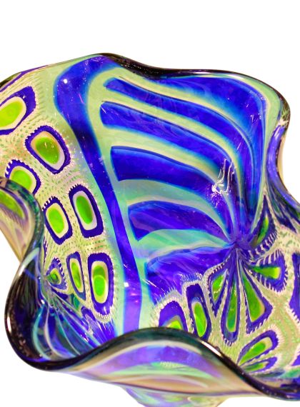 Le decorazioni (murrine e canne) sono state fuse insieme nella fornace a temperature altissime (oltre 1000°C) per creare una composizione unica. Dopo il raffreddamento, il vaso è stato lavorato con mole d'acqua per uniformare la superficie, eliminare i rilievi delle murrine e donare al vetro una finitura perfettamente liscia o satinata (come il "battuto").