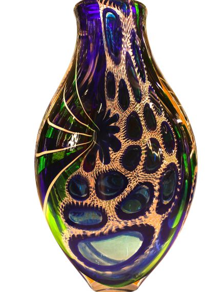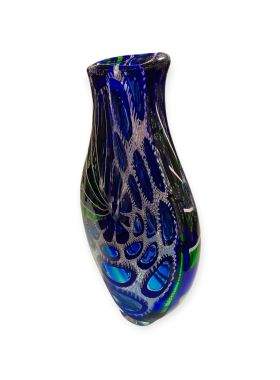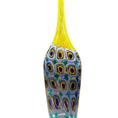 Le decorazioni (murrine e canne) sono state fuse insieme nella fornace a temperature altissime (oltre 1000°C) per creare una composizione unica. Dopo il raffreddamento, il vaso è stato lavorato con mole d'acqua per uniformare la superficie, eliminare i rilievi delle murrine e donare al vetro una finitura perfettamente liscia o satinata (come il "battuto").