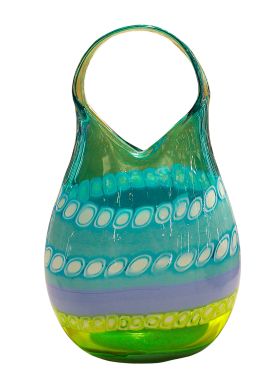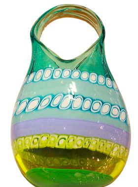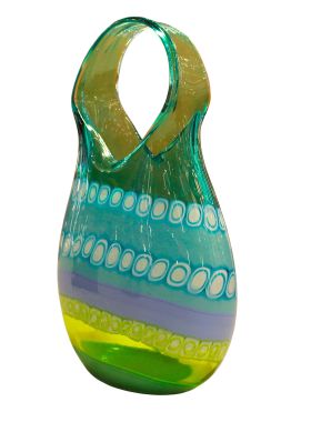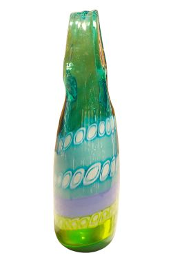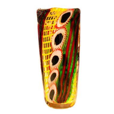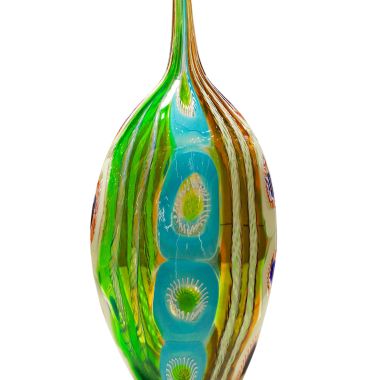 La lavorazzione di questo ogetto rappresenta l'incontro tra la tradizione millenaria e il design contemporaneo. Le decorazioni (murrine e canne) sono state fuse insieme nella fornace a temperature altissime (oltre 1000°C) per creare una composizione unica. Dopo il raffreddamento, il vaso è stato lavorato con mole d'acqua per uniformare la superficie, eliminare i rilievi delle murrine e donare al vetro una finitura perfettamente liscia o satinata (come il "battuto"). La lavorazione a pietra è un processo lungo e rischioso che trasforma il vetro da un semplice oggetto soffiato a una scultura rifinita a mano. Questa tecnica garantisce che ogni pezzo sia un pezzo unico, tipico delle fornaci d'eccellenza muranese. Sono opere di alta qualità che celebrano la maestria del "freddo e del caldo", dove il colore esplosivo della fornace viene disciplinato dalla precisione della molatura manuale del maestro vetraio.