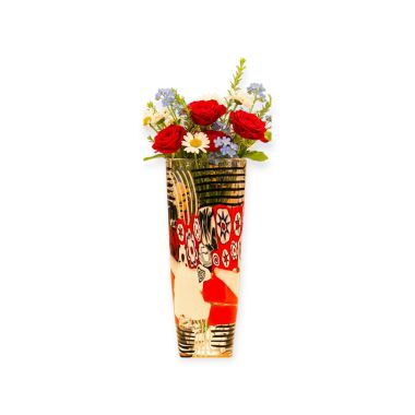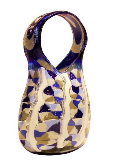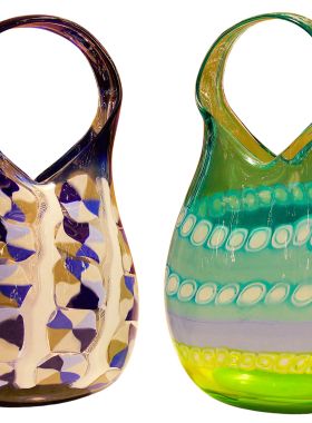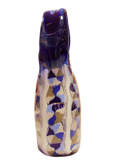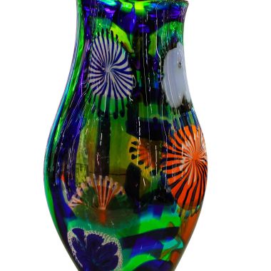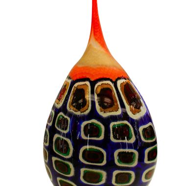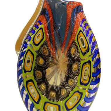 La lavorazzione di questo ogetto rappresenta l'incontro tra la tradizione millenaria e il design contemporaneo. Le decorazioni (murrine e canne) sono state fuse insieme nella fornace a temperature altissime (oltre 1000°C) per creare una composizione unica. Dopo il raffreddamento, il vaso è stato lavorato con mole d'acqua per uniformare la superficie, eliminare i rilievi delle murrine e donare al vetro una finitura perfettamente liscia o satinata (come il "battuto"). La lavorazione a pietra è un processo lungo e rischioso che trasforma il vetro da un semplice oggetto soffiato a una scultura rifinita a mano. Questa tecnica garantisce che ogni pezzo sia un pezzo unico, tipico delle fornaci d'eccellenza muranese. Sono opere di alta qualità che celebrano la maestria del "freddo e del caldo", dove il colore esplosivo della fornace viene disciplinato dalla precisione della molatura manuale del maestro vetraio.