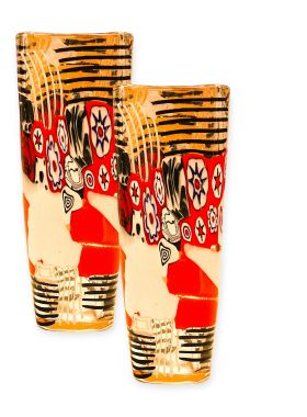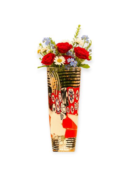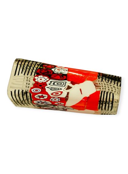 La lavorazzione di questo ogetto rappresenta l'incontro tra la tradizione millenaria e il design contemporaneo. Le decorazioni (murrine e canne) sono state fuse insieme nella fornace a temperature altissime (oltre 1000°C) per creare una composizione unica. Dopo il raffreddamento, il vaso è stato lavorato con mole d'acqua per uniformare la superficie, eliminare i rilievi delle murrine e donare al vetro una finitura perfettamente liscia o satinata (come il "battuto"). La lavorazione a pietra è un processo lungo e rischioso che trasforma il vetro da un semplice oggetto soffiato a una scultura rifinita a mano. Questa tecnica garantisce che ogni pezzo sia un pezzo unico, tipico delle fornaci d'eccellenza muranese. Sono opere di alta qualità che celebrano la maestria del "freddo e del caldo", dove il colore esplosivo della fornace viene disciplinato dalla precisione della molatura manuale del maestro vetraio.