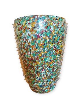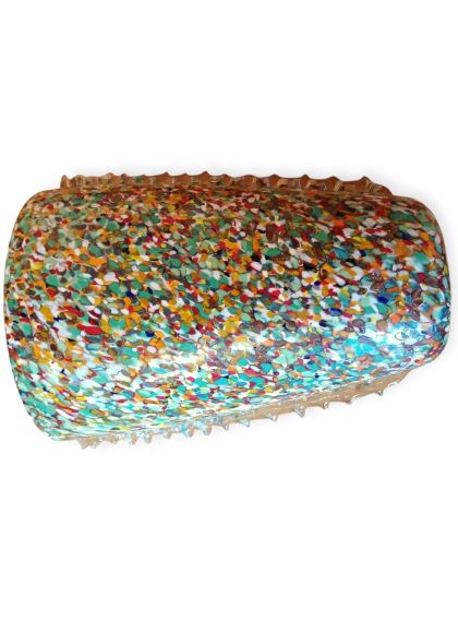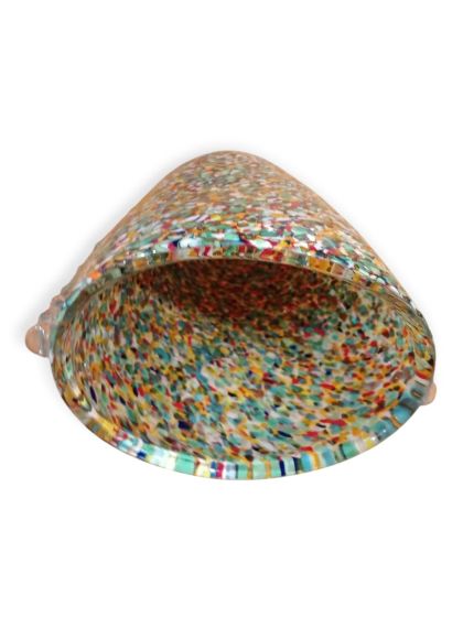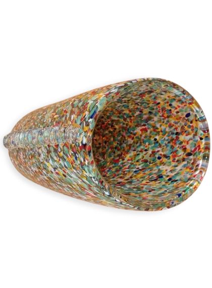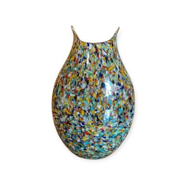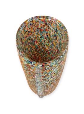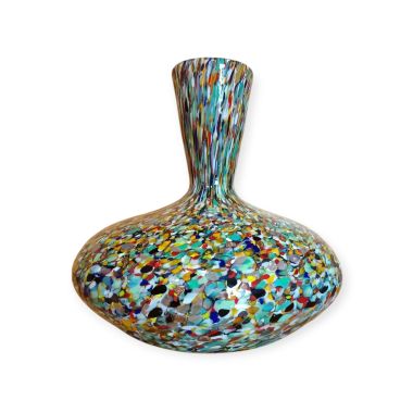 Questa specifica tipologia di manufatto muranese è un'esplosione di cromatismo e tecnica artigianale. La definizione "Arlecchino"rappresenta l'eccellenza della lavorazione del vetro a caldo. Si distingue per la tecnica della graniglia di vetro multicolore, un processo che richiede estrema precisione termica e sensibilità estetica. La superficie non è dipinta, ma è composta da migliaia di frammenti di vetro colorato (graniglie) che vengono applicati sulla massa vitrea incandescente durante la soffiatura, attraverso ripetuti passaggi nel forno i colori si fondono nel corpo centrale, rimanendo però distinti e vividi.