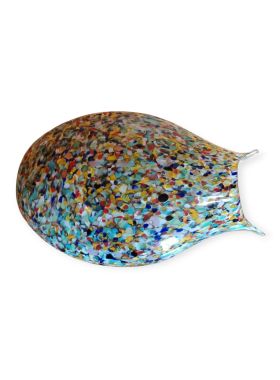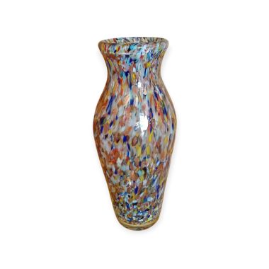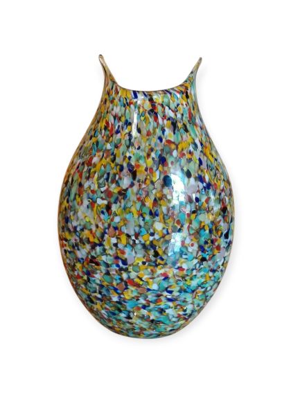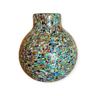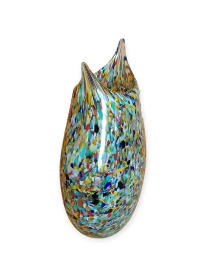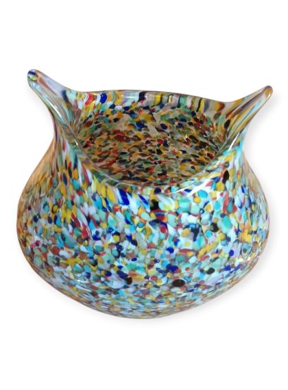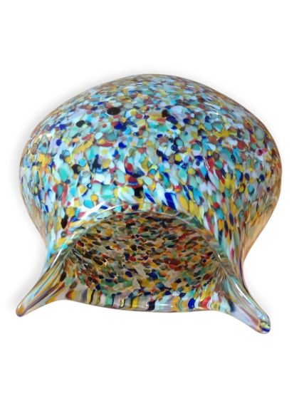 Questa specifica tipologia di manufatto muranese è un'esplosione di cromatismo e tecnica artigianale. La definizione "Arlecchino"rappresenta l'eccellenza della lavorazione del vetro a caldo. Si distingue per la tecnica della graniglia di vetro multicolore, un processo che richiede estrema precisione termica e sensibilità estetica. La superficie non è dipinta, ma è composta da migliaia di frammenti di vetro colorato (graniglie) che vengono applicati sulla massa vitrea incandescente durante la soffiatura, attraverso ripetuti passaggi nel forno i colori si fondono nel corpo centrale, rimanendo però distinti e vividi.