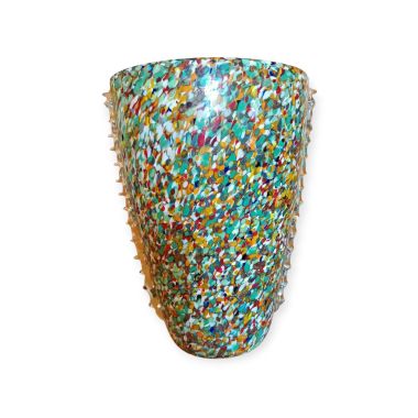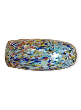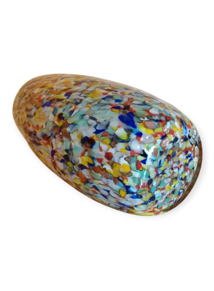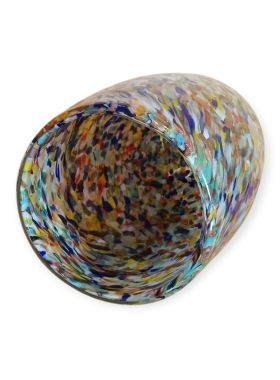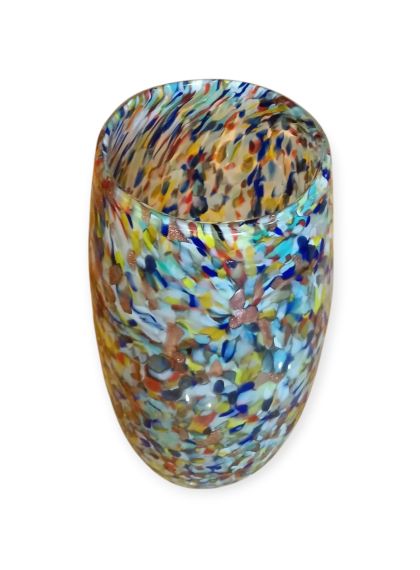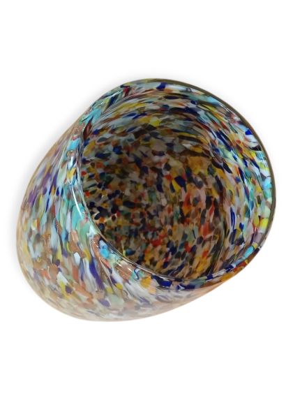 Questa specifica tipologia di manufatto muranese è un'esplosione di cromatismo e tecnica artigianale. La definizione "Arlecchino"rappresenta l'eccellenza della lavorazione del vetro a caldo. Si distingue per la tecnica della graniglia di vetro multicolore, un processo che richiede estrema precisione termica e sensibilità estetica. La superficie non è dipinta, ma è composta da migliaia di frammenti di vetro colorato (graniglie) che vengono applicati sulla massa vitrea incandescente durante la soffiatura, attraverso ripetuti passaggi nel forno i colori si fondono nel corpo centrale, rimanendo però distinti e vividi.