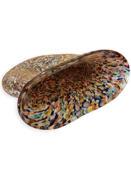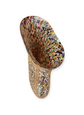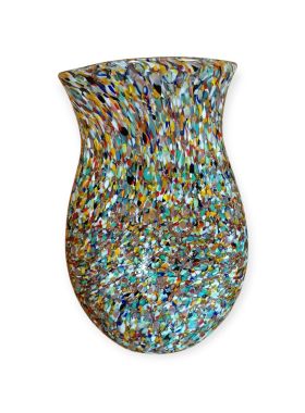 Questa specifica tipologia di manufatto muranese è un'esplosione di cromatismo e tecnica artigianale. La definizione "Arlecchino"rappresenta l'eccellenza della lavorazione del vetro a caldo. Si distingue per la tecnica della graniglia di vetro multicolore, un processo che richiede estrema precisione termica e sensibilità estetica. La superficie non è dipinta, ma è composta da migliaia di frammenti di vetro colorato (graniglie) che vengono applicati sulla massa vitrea incandescente durante la soffiatura, attraverso ripetuti passaggi nel forno i colori si fondono nel corpo centrale, rimanendo però distinti e vividi.