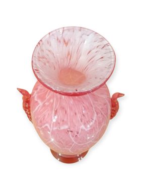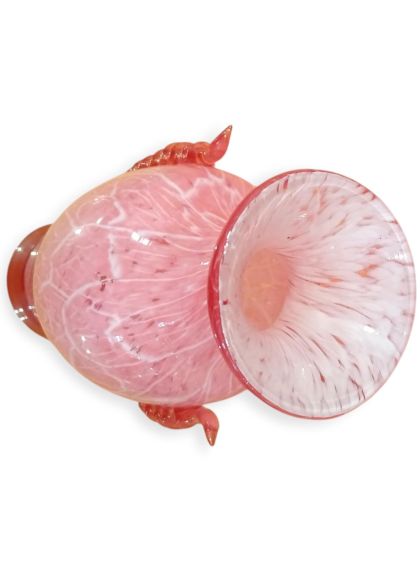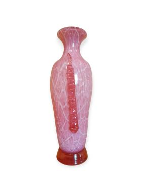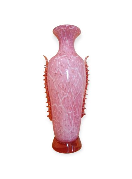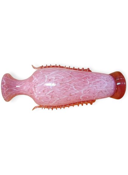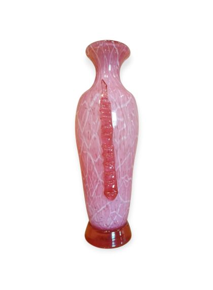 L'opera nasce da un cuore pulsante di vetro trasparente, la "paina", che viene avvolta da una doppia pelle di colore. La magia avviene nel passaggio più critico: l'immersione rapida nel secchio di acqua fredda. In quel momento, la superficie esterna subisce uno shock termico controllato, frantumandosi in mille minuscole crepe. Tuttavia, queste "ferite" non rompono l'oggetto; vengono anzi sigillate e protette da successivi strati di cristallo fuso. Il calore degli strati finali dilata le venature colorate, stirandole fino a creare quella ragnatela complessa e profonda che vediamo. Le venature non sono dipinte in superficie, ma incapsulate. Questo dona una profondità tridimensionale e colori sembrano marmo pregiato. Il contrasto tra la regolarità della forma e l'apparente caos delle venature interne rende questo pezzo un perfetto esempio di equilibrio dinamico. È un oggetto che cattura la luce in modo differente da ogni angolazione, svelando nuovi percorsi nel suo intricato reticolo interno.